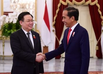 Presiden Joko Widodo menerima kunjungan kehormatan Ketua Parlemen Vietnam, Vuong Dinh Hue, beserta delegasi di Istana Merdeka, Jakarta, pada Senin, ...