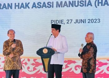 Presiden Joko Widodo meluncurkan program pelaksanaan rekomendasi penyelesaian non-yudisial pelanggaran Hak Asasi Manusia (HAM) berat di Rumoh Geudong, Kabupaten Pidie, ...