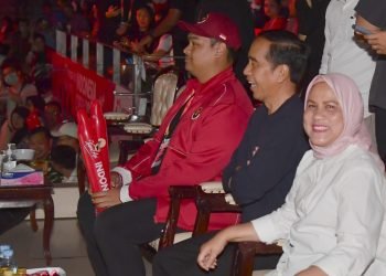 Presiden Joko Widodo bersama Ibu Iriana Joko Widodo menyaksikan langsung pertandingan semifinal kejuaraan badminton Indonesia Open 2023 di Istora Gelora ...