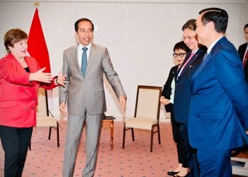 Presiden Joko Widodo menggelar pertemuan dengan Direktur Pelaksana Dana Moneter Internasional (IMF), Kristalina Georgieva, di Hotel Rihga Royal, Hiroshima, Jepang, ...
