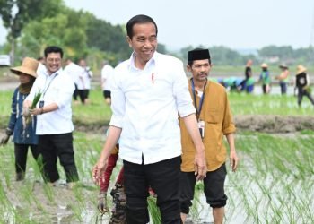 Presiden Joko Widodo didampingi Ibu Iriana Joko Widodo melakukan kegiatan percepatan tanam padi pascapanen bersama para petani di Kawasan Daulat ...