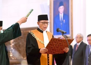 Presiden Joko Widodo menyaksikan pengucapan sumpah Sunarto sebagai Wakil Ketua Mahkamah Agung (MA) Bidang Yudisial di Istana Negara, Jakarta, pada ...