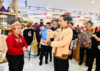 Presiden Joko Widodo meninjau sejumlah stan produk yang dihasilkan oleh para pemuda Papua di Papua Youth Creative Hub (PYCH), Jayapura, ...