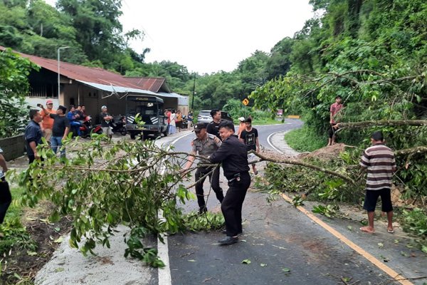 Terpantau, petugas bersama masyarakat membersihkan material longsoran berupa tanah dan bebatuan, serta mengangkat batang pohon yang melintang di badan jalan.
