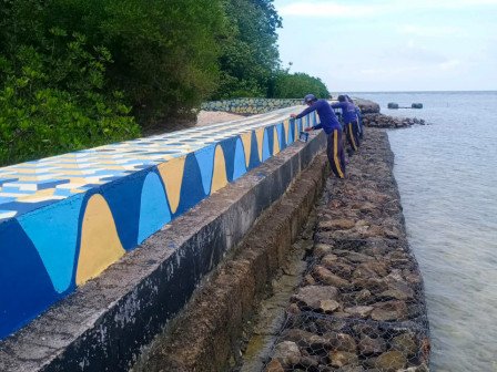 Suku Dinas Sumber Daya Air (SDA) Kepulauan Seribu melakukan pengecatan untuk mempercantik tanggul pembatas di sisi barat laut Pulau Sebira, Kelurahan Pulau Harapan, Kecamatan Kepulauan Seribu Utara.