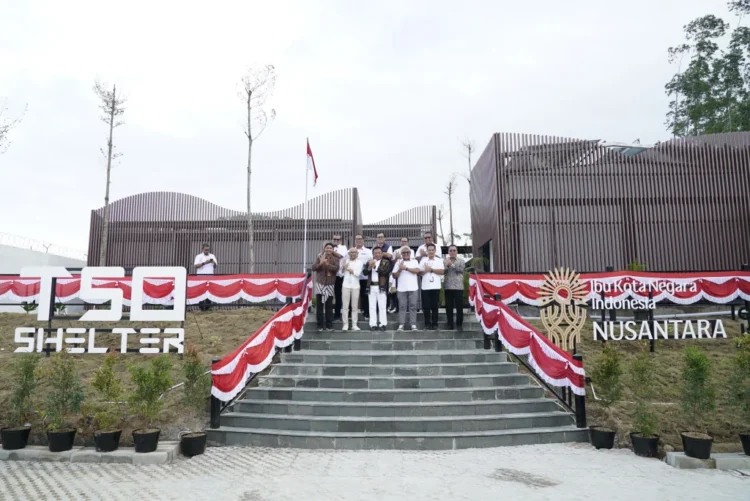 Direktur Utama Telkom Ririek Adriansyah, Direktur Network & IT Solution Telkom Herlan Wijanarko beserta jajaran senior leaders TelkomGroup saat meninjau Telkom Smart Office Shelter di Kawasan Inti Pusat Pemerintahan IKN, Sabtu (17/8).