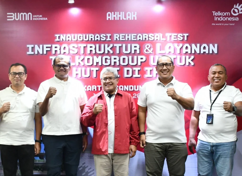 Direktur Network & IT Solution Telkom Herlan Wijanarko (tengah), Executive Vice President Telkom Regional IV Area Kalimantan Rachmad Dwi Hartanto (kedua dari kanan),  VP Network/IT Strategy, Technology, & Architecture yang juga sebagai Kepala Satgas TelkomGroup untuk IKN Ermono Liman Prabowo (paling kiri), Direktur Planning & Operations PT Telkom Infrastruktur Indonesia (TIF) Suharyoto, (kedua dari kiri), dan Executive Vice President Territory 4 TIF I Komang Widnyana Karang saat rehearsal test untuk memastikan kesiapan infrastruktur dan layanan telekomunikasi untuk dukungan HUT RI di IKN berjalan dengan baik, berlokasi di Bandung, (10/8).
