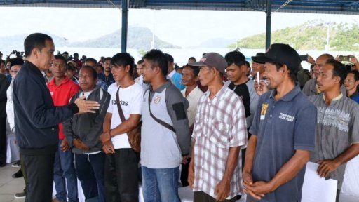 Presiden Joko Widodo dalam kunjungan kerjanya ke Kabupaten Natuna, Provinsi Kepulauan Riau, bertemu dengan ratusan nelayan. Pertemuan berlangsung di Sentra Kelautan dan Perikanan Terpadu (SKPT) Selat Lampa, Pelabuhan Perikanan Selat Lampa Natuna, Kabupaten Natuna, pada Rabu, 8 Januari 2020.