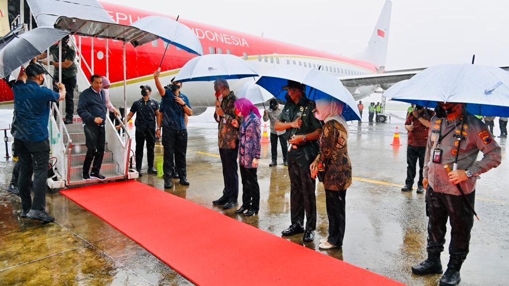 Presiden Joko Widodo dan Ibu Iriana Joko Widodo tiba di Pangkalan Udara Utama Angkatan Darat Ahmad Yani, Kota Semarang, Provinsi Jawa Tengah, pada Sabtu, 25 Februari 2023, sekitar pukul 08.40 WIB. Hujan deras dengan angin kencang sambut ketibaan Presiden Jokowi dan Ibu Iriana pagi ini.