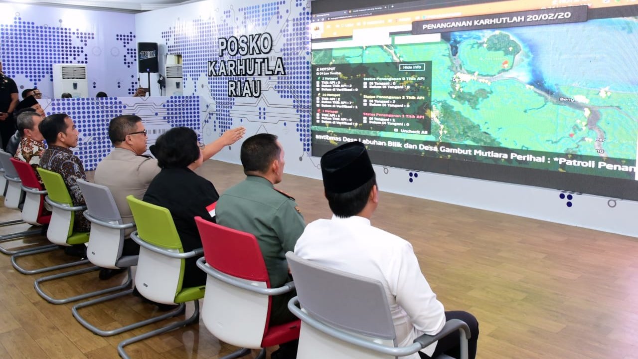 Setibanya di Pangkalan TNI AU Roesmin Nurjadin, Kota Pekanbaru, Provinsi Riau, Kamis, 20 Februari 2020, Presiden Joko Widodo langsung menuju sebuah ruangan yang dijadikan posko untuk penanganan kebakaran hutan dan lahan (karhutla) di Provinsi Riau. Di depan tempat Presiden duduk terpampang sebuah dashboard yang berisi beragam informasi terkait penanganan karhutla.