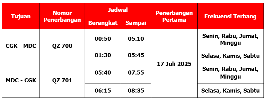 Jakarta, 10 Juni 2025 – Maskapai berbiaya hemat terbaik dunia versi Skytrax selama 15 tahun berturut-turut, Indonesia AirAsia membuka rute terbaru yang menghubungkan Jakarta dan Manado. Penerbangan akan beroperasi setiap hari mulai 17 Juli 2025, dengan tiket yang sudah dapat dipesan mulai hari ini. Kehadiran rute ini merupakan bagian dari komitmen Indonesia AirAsia untuk memperkuat konektivitas domestik sekaligus mendukung pariwisata dan mobilitas masyarakat di seluruh Tanah Air.