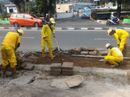 Suku Dinas Bina Marga Jakarta Selatan memperbaiki trotoar yang rusak di Jalan Raya Pasar Minggu KM 18, Kelurahan Pejaten Timur, Pancoran.