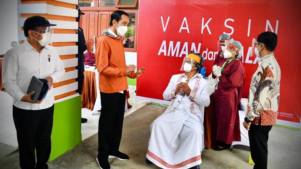 Presiden Joko Widodo dalam kunjungan kerjanya ke Provinsi Sulawesi Selatan meninjau pelaksanaan vaksinasi massal di Kabupaten Tana Toraja.
